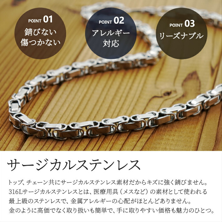 また、316Lサージカルステンレスは医療用器具にも使用されている素材でアレルギーを起こしにくい金属です。