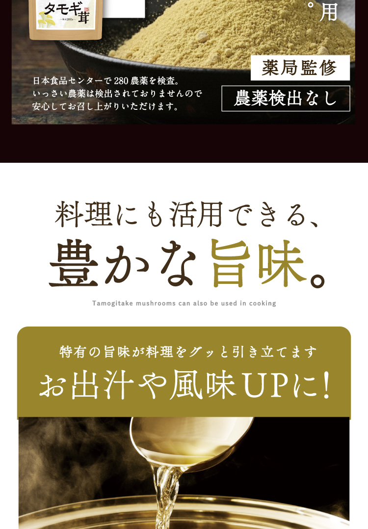 「国産 タモギタケ粉末 100g」は、タモギタケ特有の栄養成分を手軽に、食事に取り入れることができ毎日の健康サポートにおすすめ。