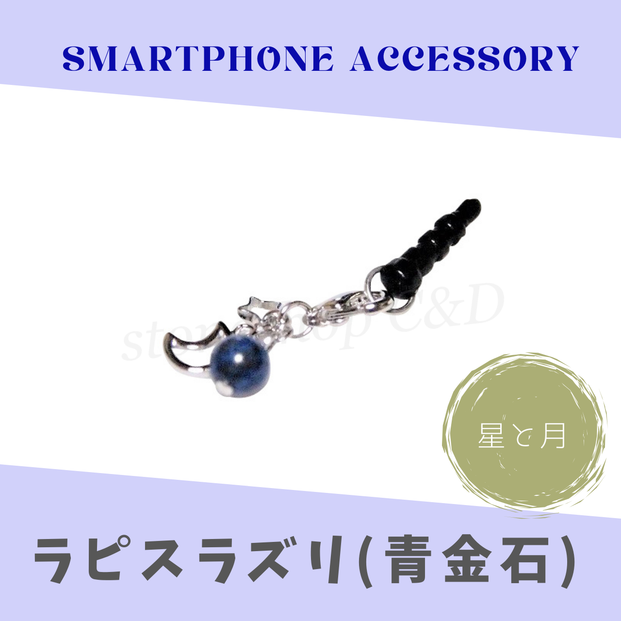 濃いブルーが綺麗なラピスラズリと月と星のメタルパーツが輝くシンプルなイヤホンジャック。