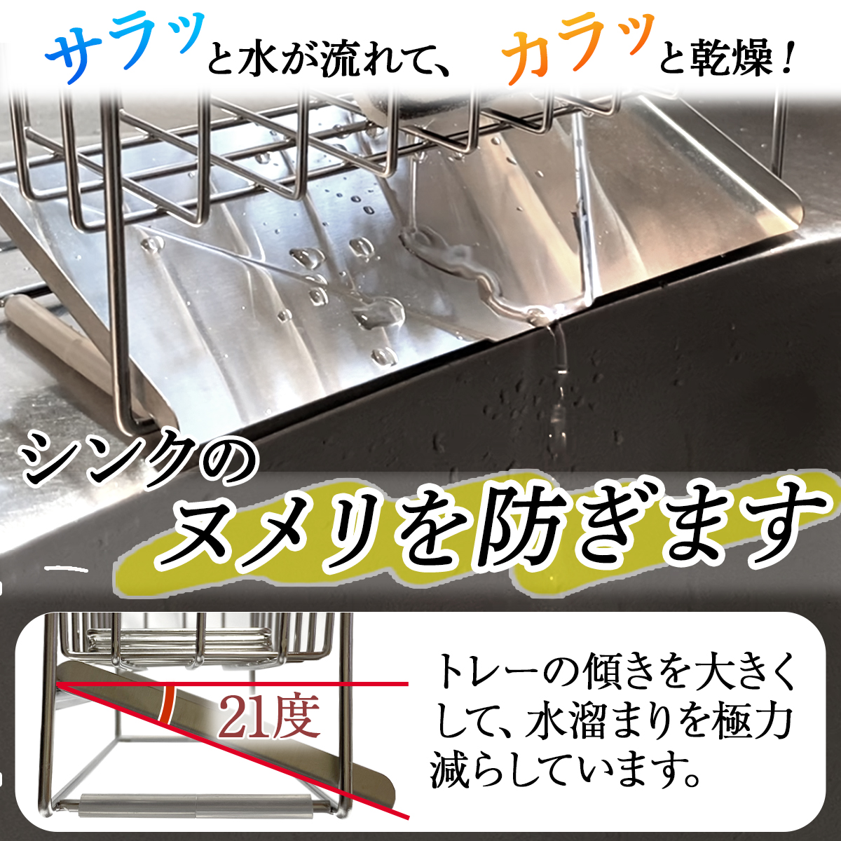 細いワイヤーで作ったラックと急角度の水切りドレンで、徹底してカラッとした環境を作り出しヌメリの発生を防ぎます