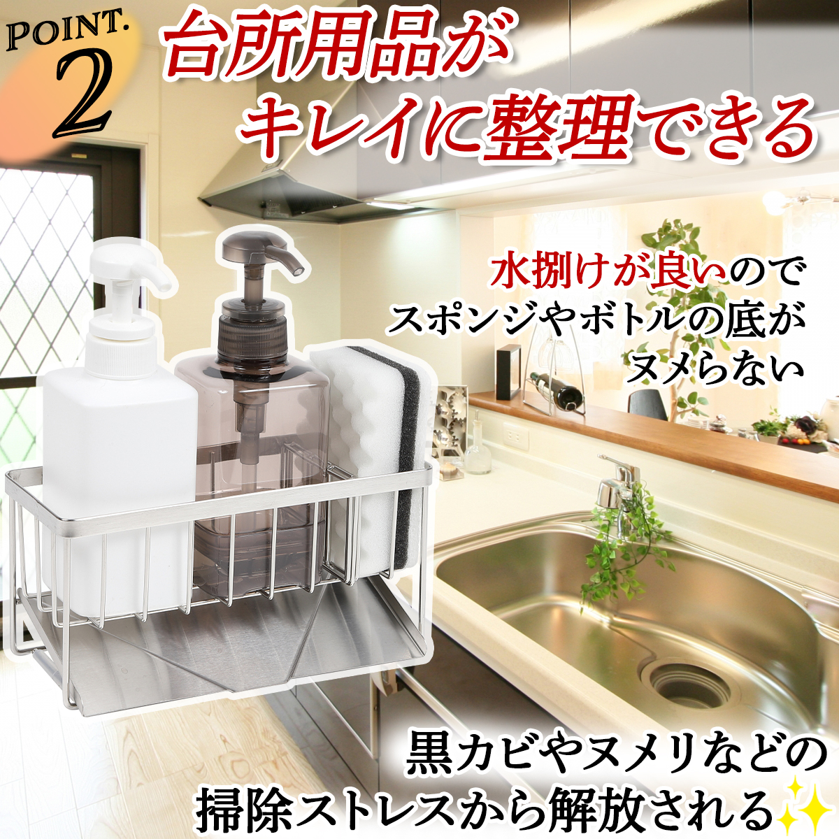 シンク周りで使うスポンジや洗剤ボトルなどを収納して、シンク周辺をすっきりと整理するとともに湿りによる黒かびやヌメリの発生を少なくします。