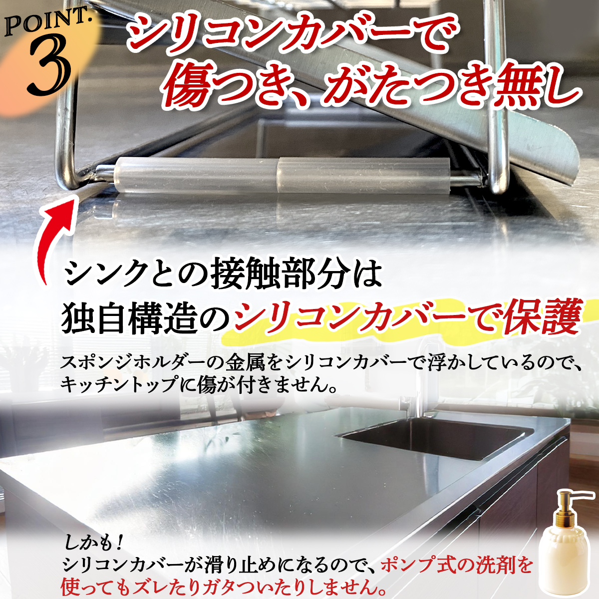 スポンジラックの底部はシリコンチューブで保護されており、大切なキッチンを傷つきから守ります