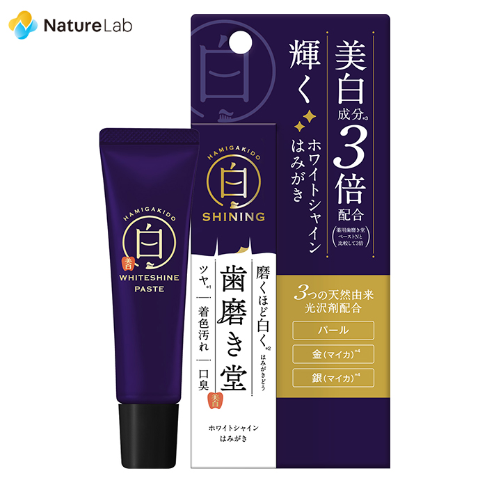 | 商品説明 | 磨くほど白く(*1)。3つの天然由来光沢剤を配合、美白成分(*2)を3倍配合したホワイトシャイン ペースト。(薬用歯磨き堂ペーストNと比較して)ツヤ(*3)・着色汚れ・口臭ケアに。 ●天然由来光沢剤:パール・金(マイカ)(*4)・銀(マイカ)(*4) ●効果・効能:歯を白くする/歯のやにをとる/口臭を防ぐ/むし歯を防ぐ/歯石の沈着を防ぐ/歯垢を除去する/口中を浄化する *1 ブラッシングにより本来の歯の白さに近づけること *2 清掃助剤:リン酸3Ca、ヒドロキシアパタイト、ケイ酸Ca *3 光沢剤による *4 金:酸化チタン・マイカ・酸化鉄、銀:酸化チタン・マイカ ※パッケージデザイン等は予告なく変更されることがあります |