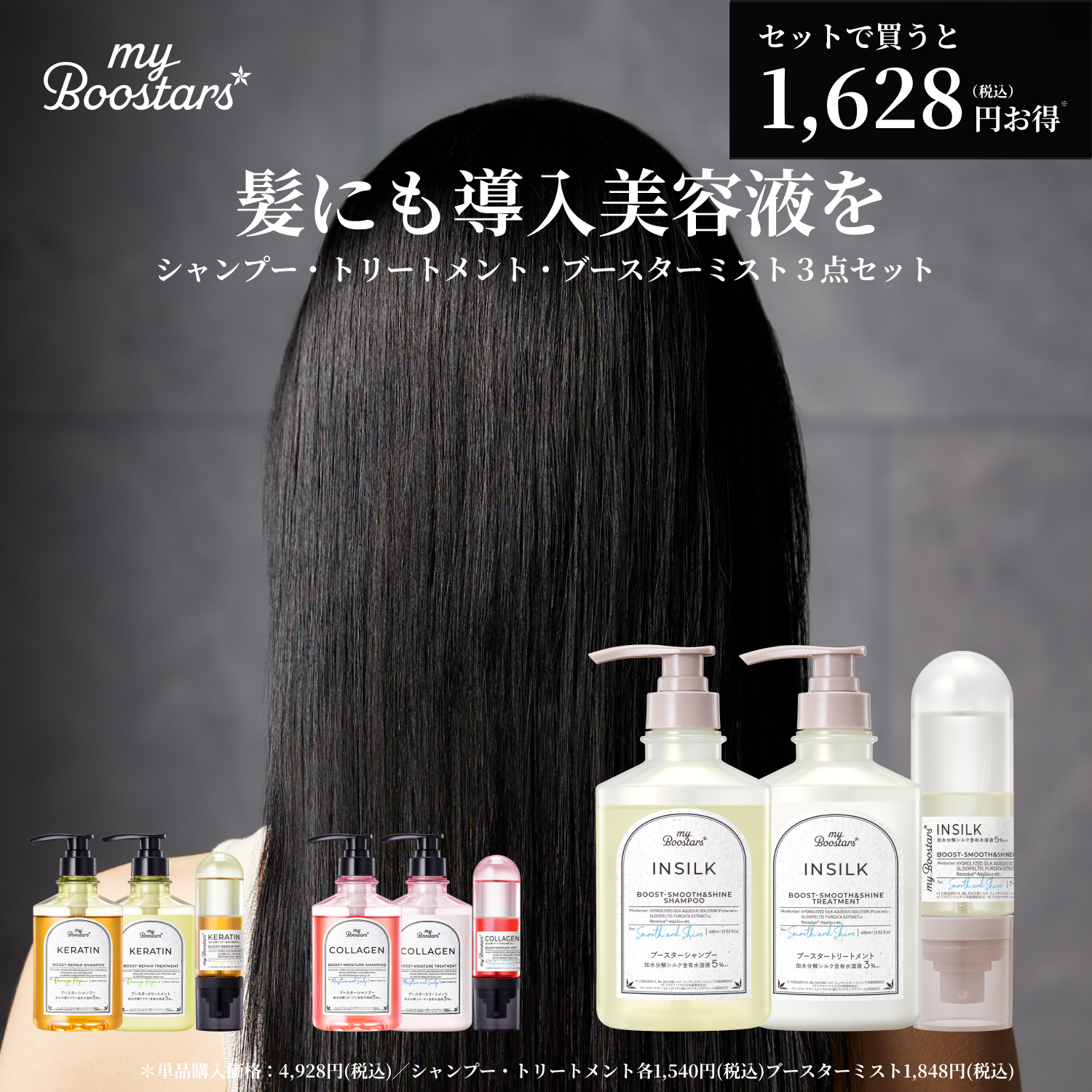 商品名 | マイブースターズ ブースター 3点セット ・ケラチン[ダメージリペア]シトラスサボンの香り ・コラーゲン[モイスチャー&スカルプ]ベルガモットアロマの香り ・インシルク ブースター ペアー&ムスクの香り |
