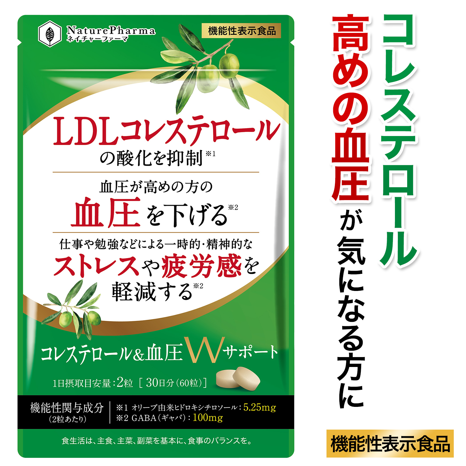 悪玉(LDL)コレステロール 血圧を下げる コレステロール&血圧Wサポート ストレス 疲労感軽減 サプリメント オリーブ ギャバ GABA 機能性表示食品 30日分