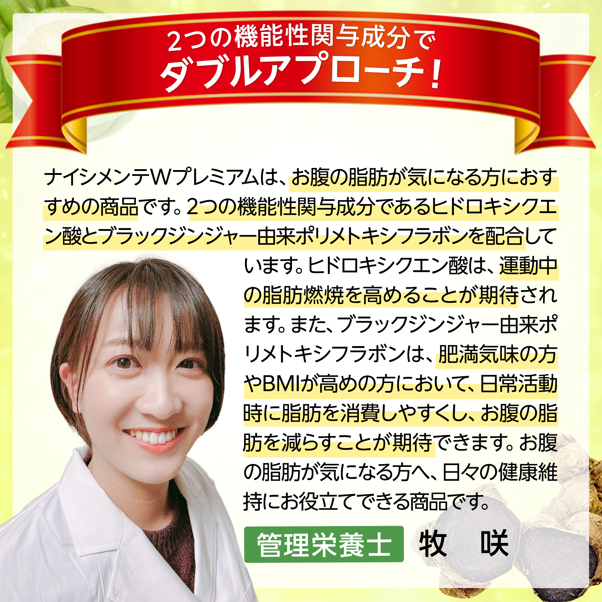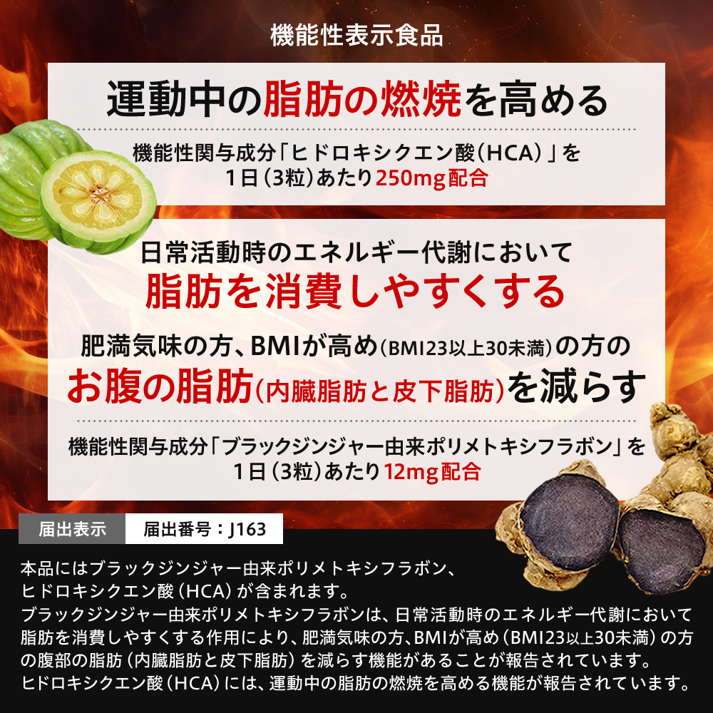 【届出表示】本品にはブラックジンジャー由来ポリメトキシフラボン、ヒドロキシクエン酸(HCA)が含まれます。ブラックジンジャー由来ポリメトキシフラボンは、日常活動時のエネルギー代謝において脂肪を消費しやすくする作用により、肥満気味の方、BMIが高め(BMI23以上30未満)の方の腹部の脂肪(内臓脂肪と皮下脂肪)を減らす機能があることが報告されています。ヒドロキシクエン酸(HCA)には、運動中の 脂肪の燃焼 を高める機能が報告されています。