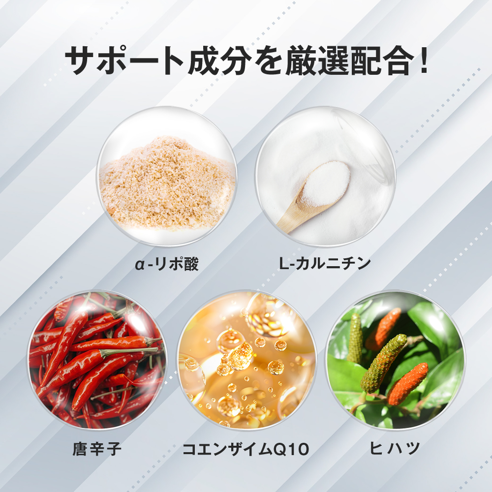 α-リポ酸、L-カルニチン、唐辛子(カプサイシン)、コエンザイムQ10、ヒハツ