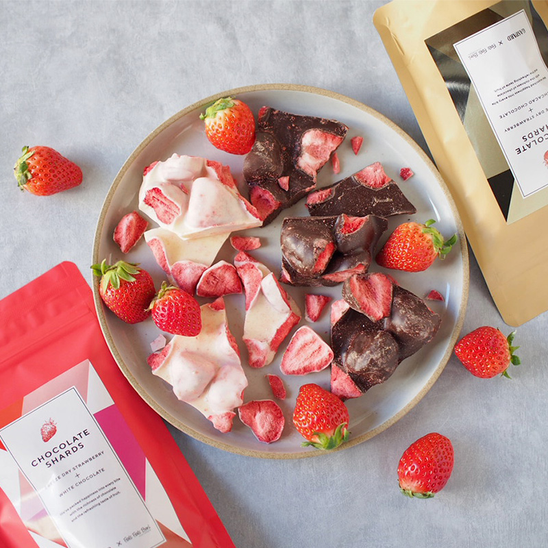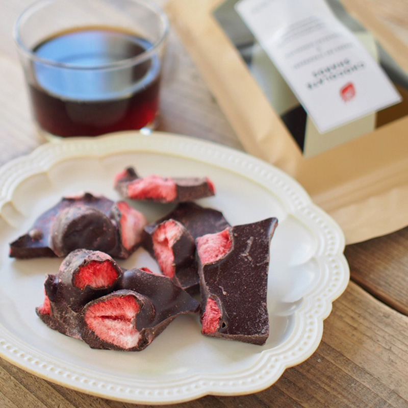 いちごの甘酸っぱさと濃厚チョコレートが繊細に重なり合い、ひと口ごとに“和”の贅沢を感じていただけます。フリーズドライいちごを惜しみなく使い、いちごの風味と食感をそのまま楽しめるスペシャルな割れチョコです。