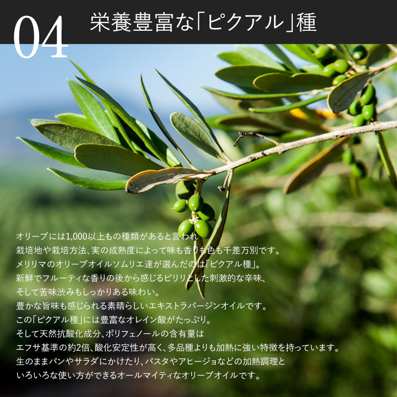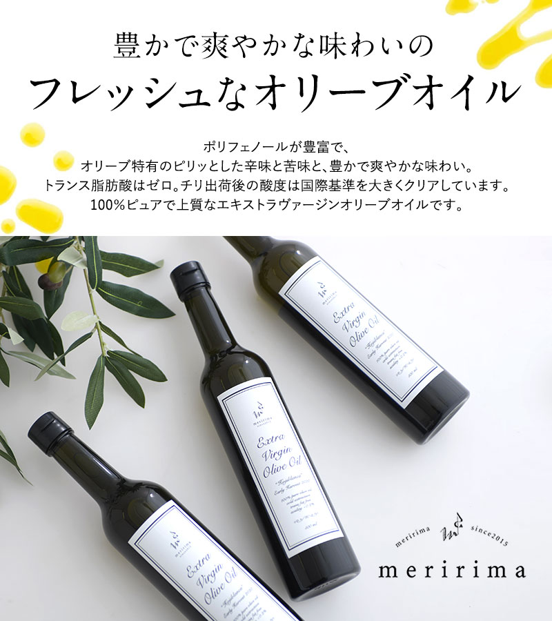 | 特徴 | ・豊かで爽やかな味わいのフレッシュなオイル 豊かで爽やかな味わいと、ポリフェノールが豊富な新鮮なオリーブ特有のピリッとした辛味も持ち合わせた本物のエキストラヴァージンオリーブオイルです。 ◆注意事項 ※油は加熱すると発煙発火します。加熱中はその場を離れないでください。 ※低温になると固形化することがありますが、品質には変わりありません。室温に置くか、ぬるま湯で温めれば元の状態に戻ります。 ※開封後はキャップを閉めて冷暗所に保存の上なるべくお早めにお使いください。 ◆ブランド meririma(メリリマ) メリリマは、大切な家族のための「あんしん、あんぜん、よいしな」を提案する、小さな小さなブランド。 誕生のきっかけとなった「米ぬか油」は、3人のアレルギーの子供たちを育てるお母さんの企画から。唐揚げやフライドポテトが大好きな子供たちに安心して食べさせることのできる、安心・安全で加熱調理に強い油を作りたい!という思いから、メリリマはスタートしました。 ひとつひとつ厳選された素材を使用した、より安心・安全でおいしい食品を製造・販売しております。 |