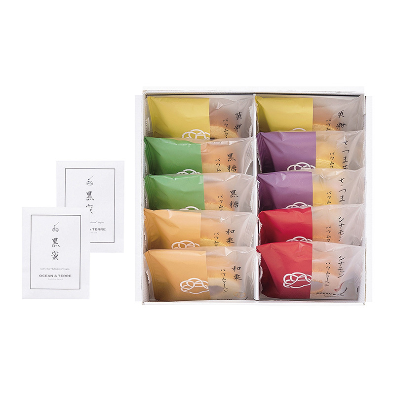 バラエティ豊かな5種類のバームクーヘンに黒蜜を別添えしたセットです。そのままでもおいしいのに、黒蜜をかけて味変(あじへん)まで楽しめるから、合計10種類の味が楽しめます。コーヒーに合う味わい。紅茶に合う味わい。日本茶に合う味わい。色々な味わいのバームクーヘンがブレイクタイムに彩りを添えます。