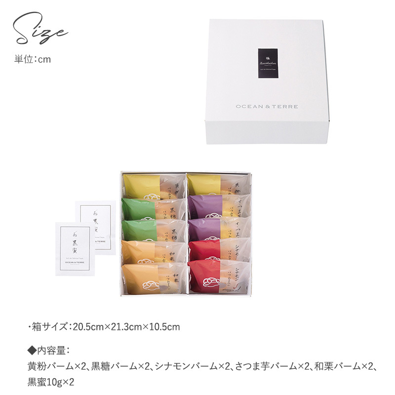 | 内容量 | 黄粉バーム×2、黒糖バーム×2、シナモンバーム×2、さつま芋バーム×2、和栗バーム×2、黒蜜10g×2 |