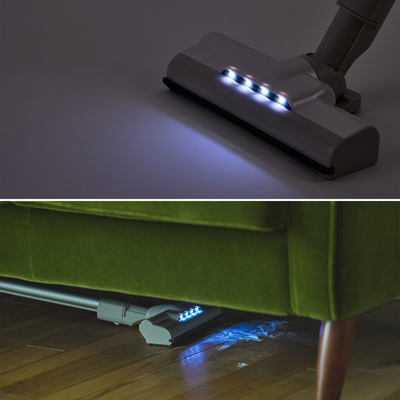 回転ブラシのヘッド部分にはLEDライトを搭載。家具の下や家の隙間もラクにお掃除できます。