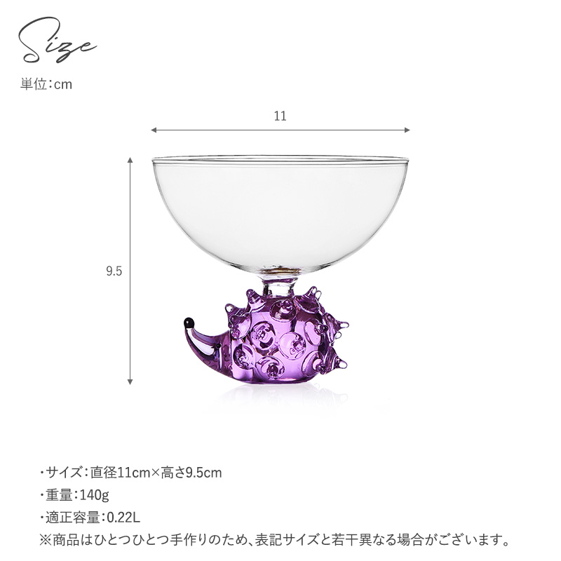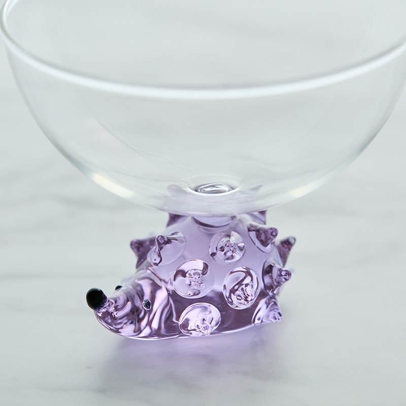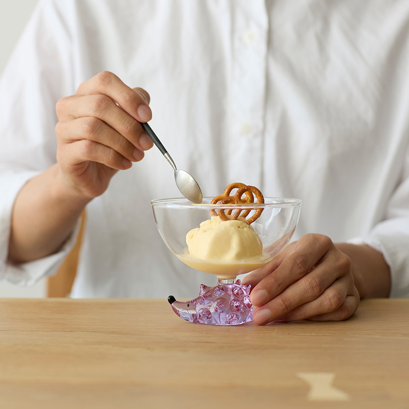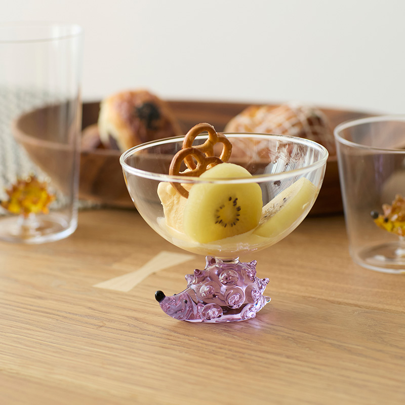 高い技術を持つガラス職人の手によって生み出される繊細なデザインが特長のアニマルファームシリーズ。デザートカップの足にハリネズミが施され、遊び心のあるかわいらしいデザインで、小物入れなどインテリアとしてもお楽しみいただけます。