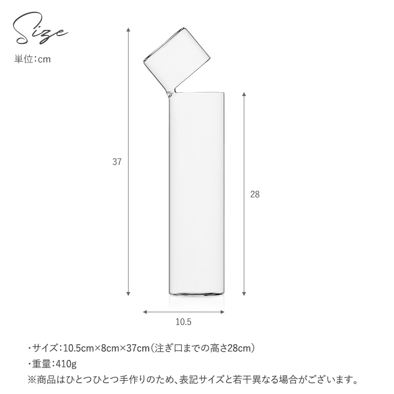 | サイズ/重量 | ・サイズ:10.5cm×8cm×37cm(注ぎ口までの高さ28cm) ・重量:410g ※商品はひとつひとつ手作りのため、表記サイズと若干異なる場合がございます。 |