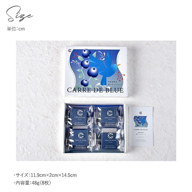 | 特徴 | ・幸せの青を贈ろう 人気のカレ・ド・シリーズの第二弾。魅力はそのままに、新たなパッケージデザインになりました。ポップの爽やかさを、ノイズ感のあるグラデーションでビジュアルライズ。青は幸せを象徴する色。あなたのもとに幸せが訪れますように。また、大切な方に幸せの青を贈りましょう。 ・チョコレート専門メーカーの極上の味 全国でも珍しいチョコレート専門メーカーの横井チョコレートと共同開発。チョコレートの風味・口どけが一番濃厚に感じられる四角に、幸せの色付けをしたカレ・ド・シリーズと同じチョコレートを使用しています。口いっぱいに広がる純粋な香りや旨味を是非ご堪能ください。 ・安心のチョコレート 口どけのいい濃厚でありながらキレのあるミルク感の強いホワイトチョコレートを使用。アグリ生活が独自に開発した青いハーブのバタフライピーを使用し、植物由来で色付けしています。合成着色料を使わない安心のチョコレートです。 ・体に良い植物で色付け 美容のハーブ バタフライピーとは、東南アジアのマメ科の植物。ポリフェノールの一種「アントシアニン」が豊富に含まれ、特に安定性が非常に高いのでアイケアやエイジングケアに使われています。厳選したホワイトチョコレートに、そんなバタフライピーを合わせた、濃厚な香りとふくよかな味わいがお楽しみいただけます。 ◆製品の注意事項 ・開封後はなるべく早くお召し上がりください。 ・高温でやわらかくなったチョコレートは冷えて固まると白くなることがあります。召し上がっても身体にさしさわりはありませんが風味は劣ります。 ・植物由来色素を使用しているため、色素の性質上退色が見受けられる場合があります。 |