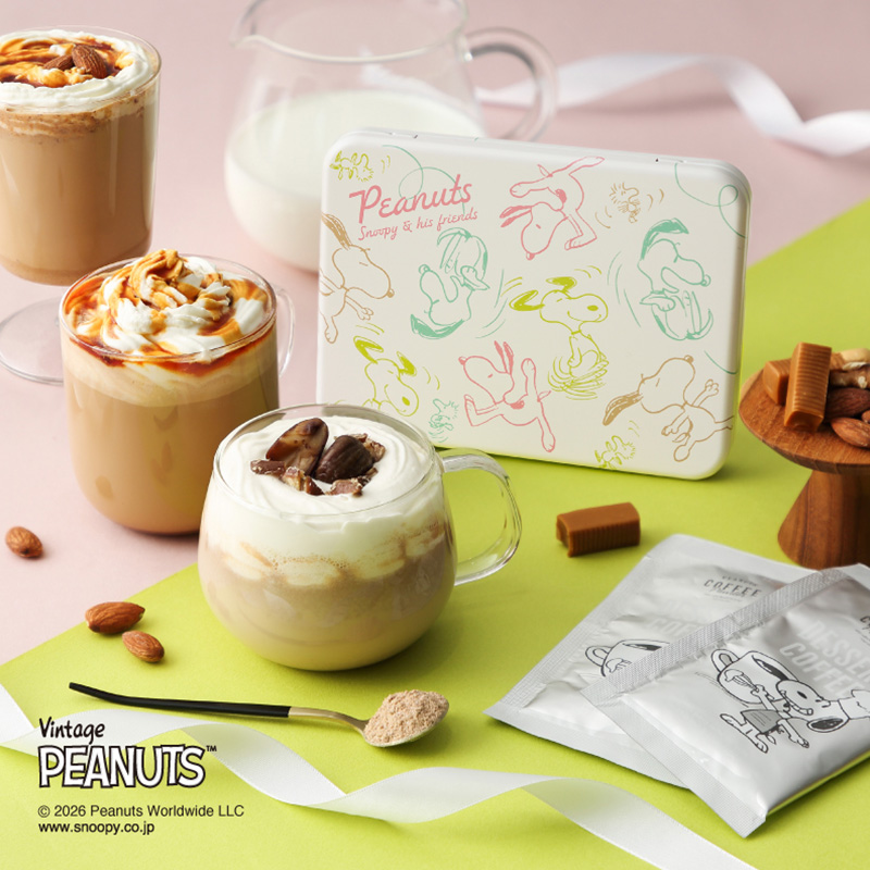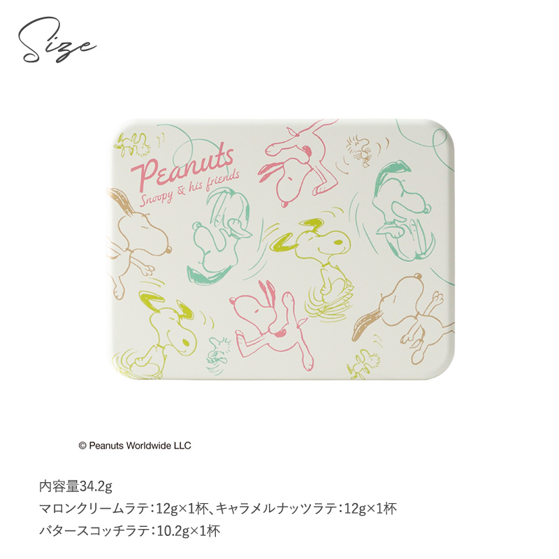 PEANUTSの世界観をイメージした、やさしい味わいのラテ3種を、スヌーピーがかわいい缶にアソート。飲み終わった後も小物入れなどに使え、楽しさが続きます。