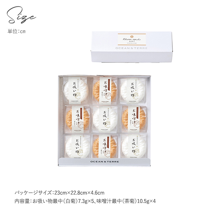 | 内容量 | お吸い物最中(白菊)7.3g×5、味噌汁最中(茶菊)10.5g×4 ※もち米 100%(国産)最中種 |
