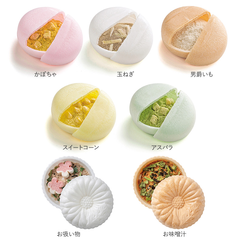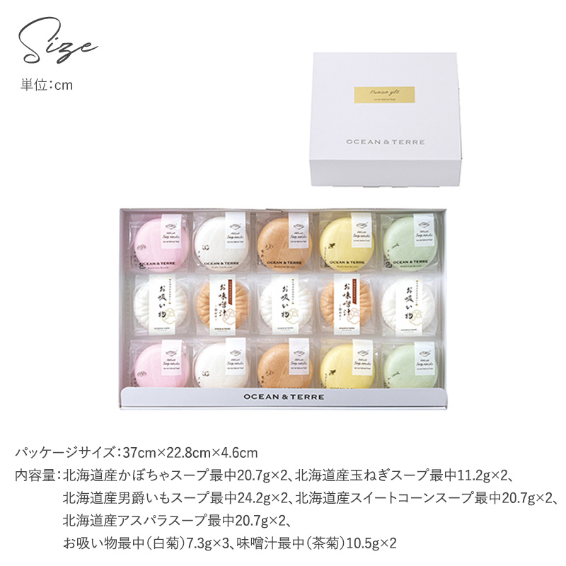 | 内容量 | 北海道産かぼちゃスープ最中20.7g×2、北海道産玉ねぎスープ最中11.2g×2、北海道産男爵いもスープ最中24.2g×2、北海道産スイートコーンスープ最中20.7g×2、北海道産アスパラスープ最中20.7g×2、お吸い物最中(白菊)7.3g×3、味噌汁最中(茶菊)10.5g×2 ※もち米 100%(国産)最中種 |