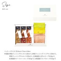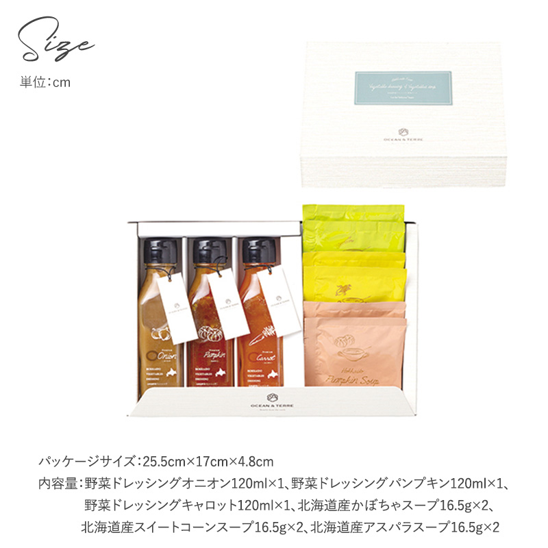| 内容量 | 野菜ドレッシングオニオン120ml×1、野菜ドレッシングパンプキン120ml×1、野菜ドレッシングキャロット120ml×1、北海道産かぼちゃスープ16.5g×2、北海道産スイートコーンスープ16.5g×2、北海道産アスパラスープ16.5g×2 |