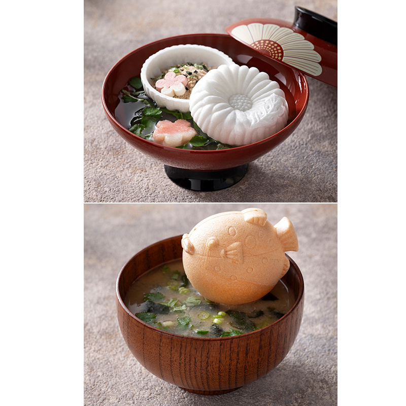最中は国産100%の最中種から作られており、昔から愛されてきた日本の味を、食感を楽しみながらお召し上がりいただけます。あっさりとしていながらも奥深い一杯で、目と舌で楽しむほっと温かいお吸い物とお味噌汁。菊紋とフグ型の最中で包みました。