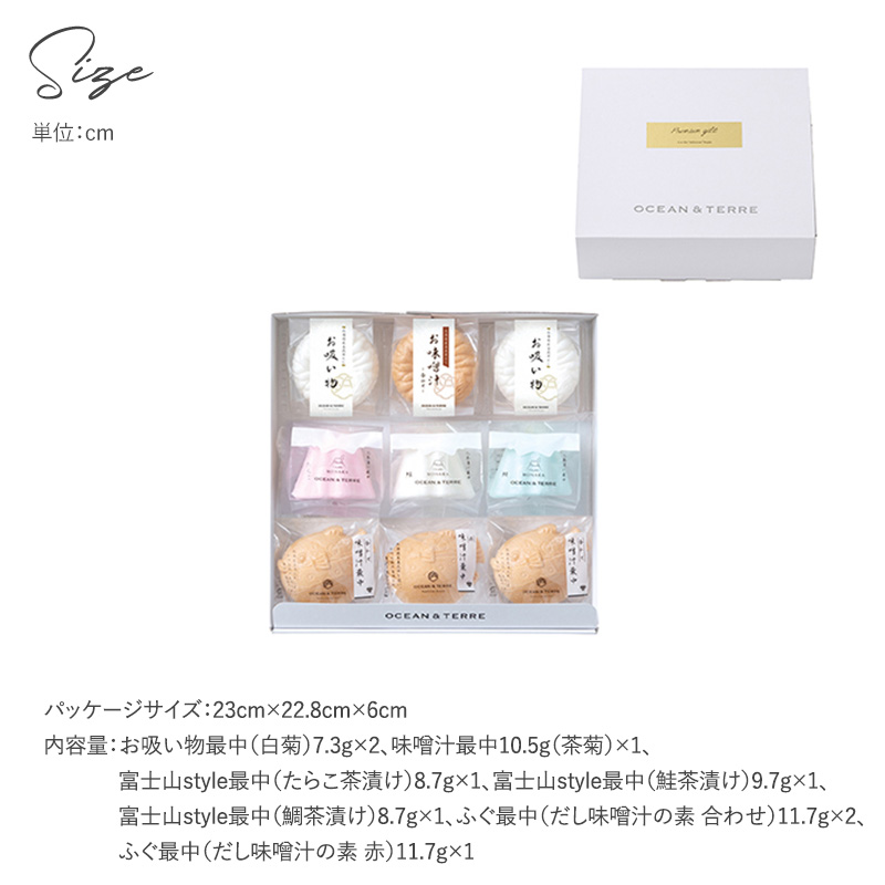 | 特徴 | ・和の贅沢な味わいが楽しめるセット 美しく縁起のいい富士山の最中に包まれたお茶漬けと、高貴で気品のある菊紋の最中に包まれたお吸い物とお味噌汁、かわいいフグ型の最中に包まれたお味噌汁の詰め合わせ。手軽で見栄えも楽しく、お子さまからご年配の方まで気軽にお召し上がりいただけます。 ・おいしい、美しい、縁起がいい 日本の象徴であり、縁起物の中でも人気の高い富士山の最中でお茶漬けの素を包みました。味は「たらこ、鮭、鯛」の3種類。ご飯の上に乗せて熱湯を注ぐだけで、最中が溶けてお茶漬けの出来上がり。 ・目と舌で楽しむ一杯 最中は国産100%の最中種から作られており、昔から愛されてきた日本の味を、食感を楽しみながらお召し上がりいただけます。あっさりとしていながらも奥深い一杯で、目と舌で楽しむほっと温かいお吸い物とお味噌汁。菊紋とフグ型の最中で包みました。 ・お祝いやお返しのギフトにおすすめ 洗練されたギフトボックスに入れてお届けします。内祝い、ご挨拶、引き出物など、お祝いやお返しにぴったりのギフトセットです。お酒が好きな方や、甘いものが苦手な方への贈り物にもおすすめです。 ◆ブランド OCEAN & TERRE(オーシャン&テール) 日本の自然の恵みをシンプルに伝える。厳選された海(OCEAN)と大地(TERRE)の宝物を大切に、丁寧に手を加え、本物の美味しさを…。贅沢な時間をお届けするギフトコレクションです。 |