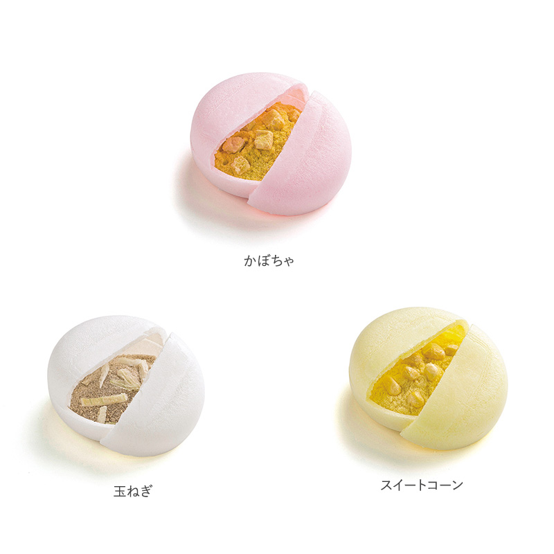 カラフルな最中で野菜スープの素を包んだ3種類の野菜スープ最中。味は「かぼちゃ、玉ねぎ、スイートコーン」の3種類。見た目だけではなく、最中の香ばしいとろみと自然の味わいをお楽しみいただけます。