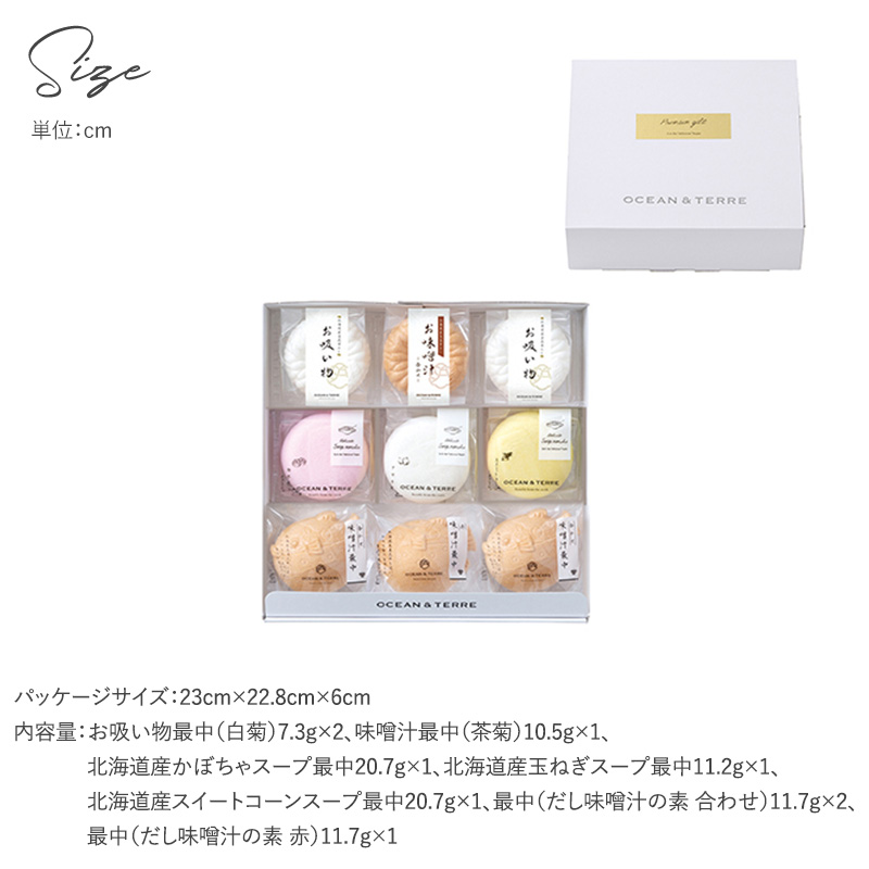 | 内容量 | お吸い物最中(白菊)7.3g×2、味噌汁最中(茶菊)10.5g×1、北海道産かぼちゃスープ最中20.7g×1、北海道産玉ねぎスープ最中11.2g×1、北海道産スイートコーンスープ最中20.7g×1、最中(だし味噌汁の素 合わせ)11.7g×2、最中(だし味噌汁の素 赤)11.7g×1 ※もち米 100%(国産)最中種 |
