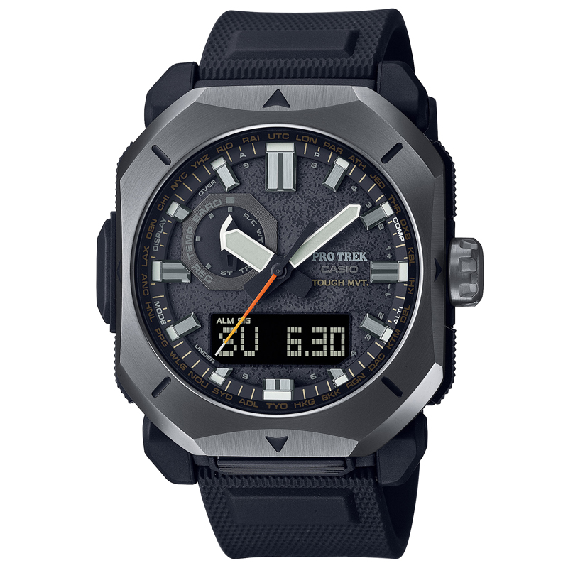 商品説明 ●ダブルLEDライト:文字板用・LCD部用 ●精度:平均月差±15秒(電波受信が行われない場合) ●自然を愛する人の本格アウトドアギアPROTREKから、環境に配慮されたエコ素材を採用した、電波ソーラー搭載のPRW-6900シリーズ。 ●荒々しいアウトドアスタイルをデザインテーマに定め、武骨な薪割りの斧をイメージした、側面を削ぎ落としたシャープな形状のメタルベゼルを採用。 ●10時位置にあるインダイアルの針も、アウトドアツールのナイフをイメージした鋭角的なデザイン形状にしています。 ●秒針には揺れる炎をイメージさせるオレンジグラデーションを配色。 ●文字板には、ダッチオーブンのような鋳物の表面を想起させる凹凸感あるデザインが入っています。 ●環境に配慮したバイオマスプラスチック素材のソフトウレタンバンドで、ケースと樹脂製の裏蓋にもバイオマスプラスチックの素材を使用しています。 ●時計本来の機能として世界6局の電波を受信するマルチバンド6やタフソーラーなど実用的な機能も兼ね備えます。様々なシーンで対応する高い機能性と実用性を詰め込んだモデルです。 ●/3352488 仕様/規格 ●ケース・ベゼル材質:樹脂・ステンレススチール ●サイズ(H×W×D):49.6×44.8×14.7mm ●質量:65g ●ソフトウレタンバンド ●タフソーラー ●10気圧防水 ●電波受信機能 ●ワールドタイム:世界29都市(29タイムゾーン、サマータイム設定機能付き)+UTC(協定世界時)の時刻表示、ホームタイムの都市入替機能、UTCダイレクト呼出機能 ●針位置自動補正機能 ●針退避機能 ●方位計測機能。方位補正機能 ●気圧計測機能(計測範囲:260〜1100hPa)、気圧傾向グラフ、気圧差インジケーター、気圧傾向インフォメーションアラーム ●高度計測機能(計測範囲:-700〜10000m)、高度差インジケーター、高度傾向グラフ、高度メモリー ●温度計測機能(計測範囲:-10〜60度) ●ストップウオッチ(1/100秒、24時間計 ●タイマー(セット単位:1分、最大セット:60分、1秒単位で計測) ●時刻アラーム5本・時報 ●バッテリーインジケーター表示 ●パワーセービング機能 ●フルオートカレンダー ●12/24時間制表示切替 ●耐低温仕様(-10度) ●操作音ON/OFF切替機能 メーカー品番 PRW-6900Y-1JF 関連商品 プロトレック 【国内正規品】PRW-6900Y-3JF 10気圧防水 カーキ プロトレック 【国内正規品】PRW-6900YL-5JF 10気圧防水 ブラウン プロトレック 【国内正規品】PRW-6900BF-1JF 10気圧防水 グレー プロトレック 【国内正規品】PRW-6900YB-3JF 10気圧防水 カーキ 対象ユーザー |