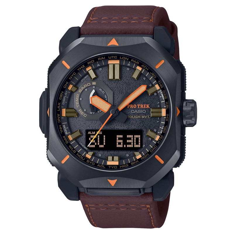 商品説明 ●ダブルLEDライト:文字板用・LCD部用 ●精度:平均月差±15秒(電波受信が行われない場合) ●自然を愛する人の本格アウトドアギアPROTREKから、環境に配慮されたエコ素材を採用した、電波ソーラー搭載のPRW-6900シリーズ。 ●荒々しいアウトドアスタイルをデザインテーマに定め、武骨な薪割りの斧をイメージした、側面を削ぎ落としたシャープな形状のメタルベゼルを採用。 ●10時位置にあるインダイアルの針も、アウトドアツールのナイフをイメージした鋭角的なデザイン形状にしています。 ●秒針には揺れる炎をイメージさせるオレンジグラデーションを配色。 ●文字板には、ダッチオーブンのような鋳物の表面を想起させる凹凸感あるデザインが入っています。 ●皮バンドには火の粉が掛かっても燃え広がりにくい難燃素材を採用しているので、アウトドアスタイルテーマに相応しい仕様になっています。 ●ケースと樹脂製の裏蓋にはバイオマスプラスチックの素材を使用。 ●時計本来の機能として世界6局の電波を受信するマルチバンド6やタフソーラーなど実用的な機能も兼ね備えます。様々なシーンで対応する高い機能性と実用性を詰め込んだモデルです。 仕様/規格 ●ケース・ベゼル材質:樹脂・ステンレススチール ●サイズ(H×W×D):49.6×44.8×14.7mm ●質量:63g ●合成皮革バンド ●タフソーラー ●10気圧防水 ●電波受信機能 ●ワールドタイム:世界29都市(29タイムゾーン、サマータイム設定機能付き)+UTC(協定世界時)の時刻表示、ホームタイムの都市入替機能、UTCダイレクト呼出機能 ●針位置自動補正機能 ●針退避機能 ●方位計測機能。方位補正機能 ●気圧計測機能(計測範囲:260〜1100hPa)、気圧傾向グラフ、気圧差インジケーター、気圧傾向インフォメーションアラーム ●高度計測機能(計測範囲:-700〜10000m)、高度差インジケーター、高度傾向グラフ、高度メモリー ●温度計測機能(計測範囲:-10〜60度) ●ストップウオッチ(1/100秒、24時間計 ●タイマー(セット単位:1分、最大セット:60分、1秒単位で計測) ●時刻アラーム5本・時報 ●バッテリーインジケーター表示 ●パワーセービング機能 ●フルオートカレンダー ●12/24時間制表示切替 ●耐低温仕様(-10度) ●操作音ON/OFF切替機能 メーカー品番 PRW-6900YL-5JF 関連商品 プロトレック 【国内正規品】PRW-6900Y-1JF 10気圧防水 ブラック プロトレック 【国内正規品】PRW-6900Y-3JF 10気圧防水 カーキ プロトレック 【国内正規品】PRW-6900BF-1JF 10気圧防水 グレー プロトレック 【国内正規品】PRW-6900YB-3JF 10気圧防水 カーキ 対象ユーザー |