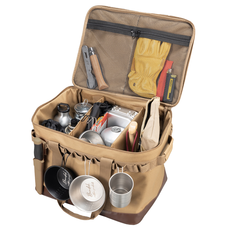 キャンプギアをまとめて収納。位置調整可能な仕切り2枚付属。底面には防水素材を用いた地面に直置きできるギアケース。外面にはクッション材が入っており、中に入れた物を衝撃から守ります。