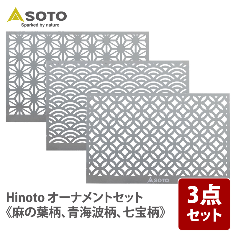 商品説明 ●和をモチーフにした麻の葉(あさのは)柄、青海波(せいがいは)柄、七宝(しっぽう)柄の3種類をセットにしました。 ●それぞれの柄をお好みでチョイスしていただくことで、アウトドアでのひとときを煌びやかに演出します。 ●【特徴1】 ●耐熱性、耐久性に優れたステンレス素材のシートへ日本の伝統的模様をあしらいました。 ●【特徴2】 ●厚さ0.05mmの薄くてしなやかなシートはホヤ内側への着脱が簡単に行えます。 ●【特徴3】 ●3種類のデザインから選べ、和の趣や風情を感じるアウトドアでのひとときを演出します。 ●【特徴4】 ●オーナメントの取り付けはとても簡単。シートを丸めてホヤの中へ入れるだけ。 ●※Hinoto 本体は別売です 仕様/規格 ●サイズ:幅96mm×高さ61mm×厚み0.05mm ●材質:ステンレス ●重量:(各)1g ●生産国:日本 メーカー品番 関連商品 SOTO Hinoto(ひのと) (※収納ケースセット) シルバー SOTO Hinoto オーナメント 七宝 シルバー SOTO Hinoto オーナメント 青海波 シルバー SOTO Hinoto オーナメント麻の葉 シルバー 対象ユーザー |
