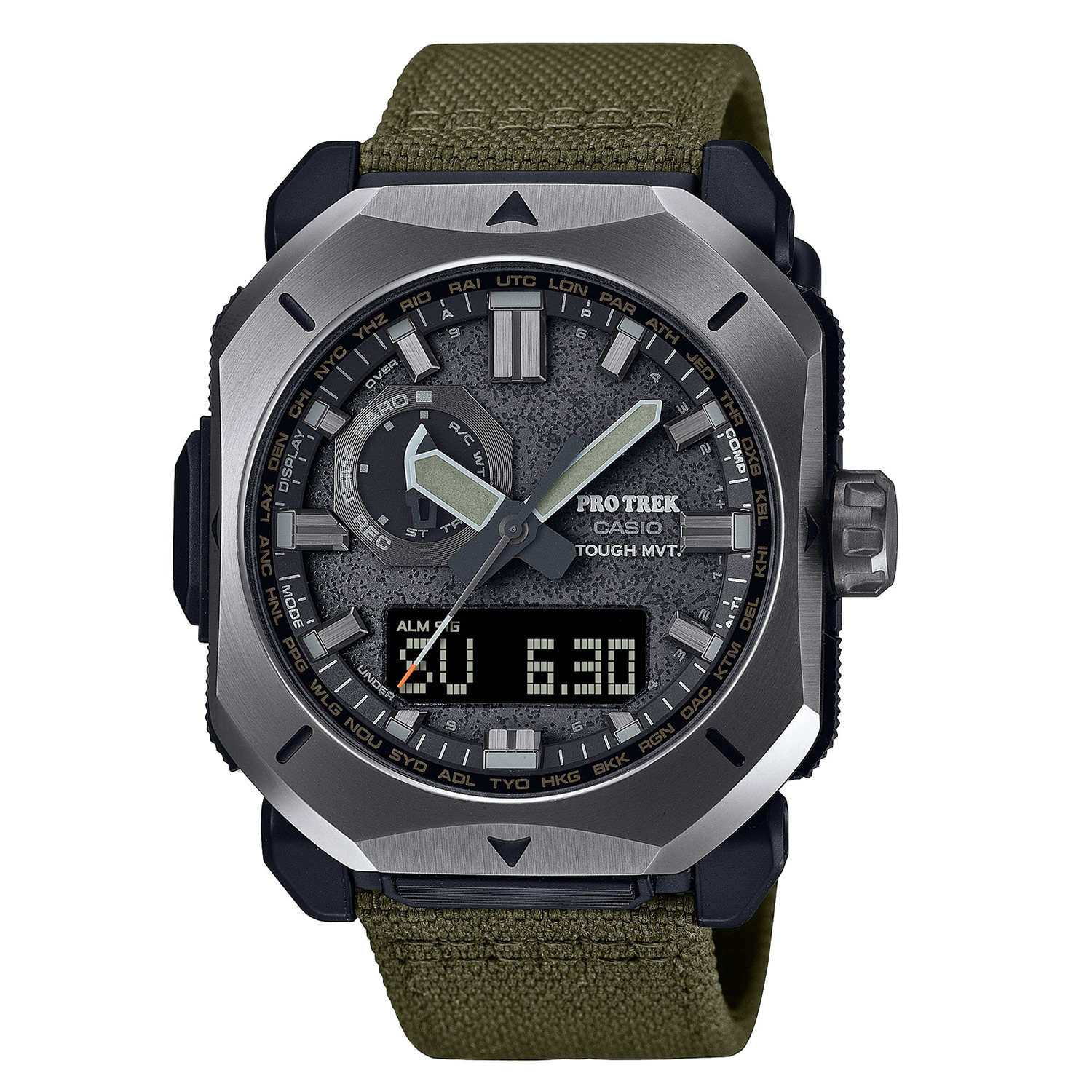 ●PRW-6900では、荒々しいアウトドアスタイルをデザインテーマに定め、武骨な薪割りの斧をイメージした、側面を削ぎ落としたシャープな形状のメタルベゼルを採用しています。
