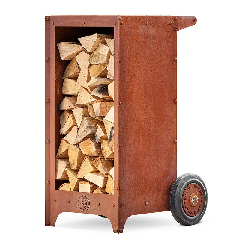 ●大きな車輪付きで薪の運搬に利用できる薪ラックで、コールテン鋼を使用している為、錆びさせることにより、屋外で置きっぱなしで使うことができます。