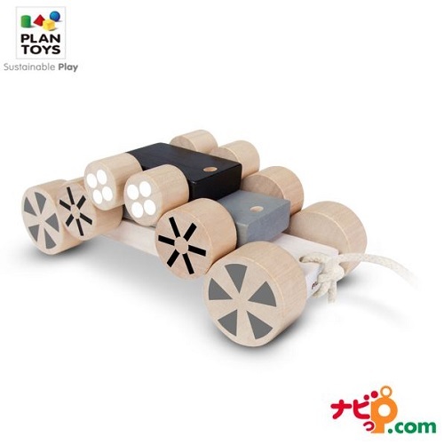 組み合わせができる3台の車で構成されたプルトイです。車を積み上げたり、荷台に積み木を組み立ててトラックにしたり、色々な遊びができます。車輪には異なる模様がついており、走らせるとそれぞれ別のパターンが表れます。