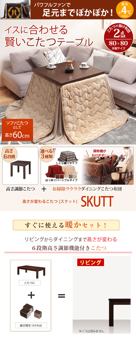 こたつ + 掛布団 セット ダイニングテーブル 椅子用 ローテーブル こたつ布団 正方形 高さ調節 昇降 ロータイプ 継ぎ足 80×80 コンパクト ミニ 一人暮らし