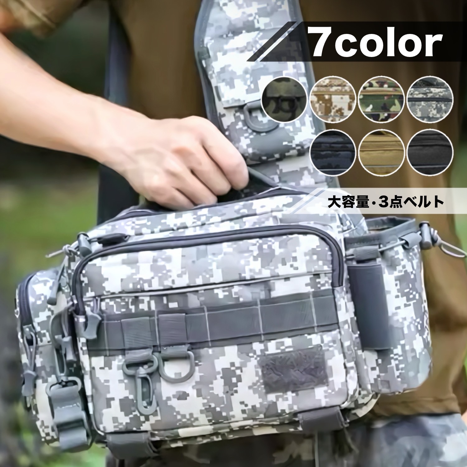 【大容量】:大型フロントポケット、サイドポケットを配置。メインポケット3段構造、メインポケットには中型ボックス(24x12cm程度)が2、3個程度収納可能。財布、スマホなど入れることができます。フィッシュグリップ 釣竿固定バンド付きロッドホルダー付き、サバイバルゲーム バイク キャンプ ウエストバッグ としてもお使いいただけます。