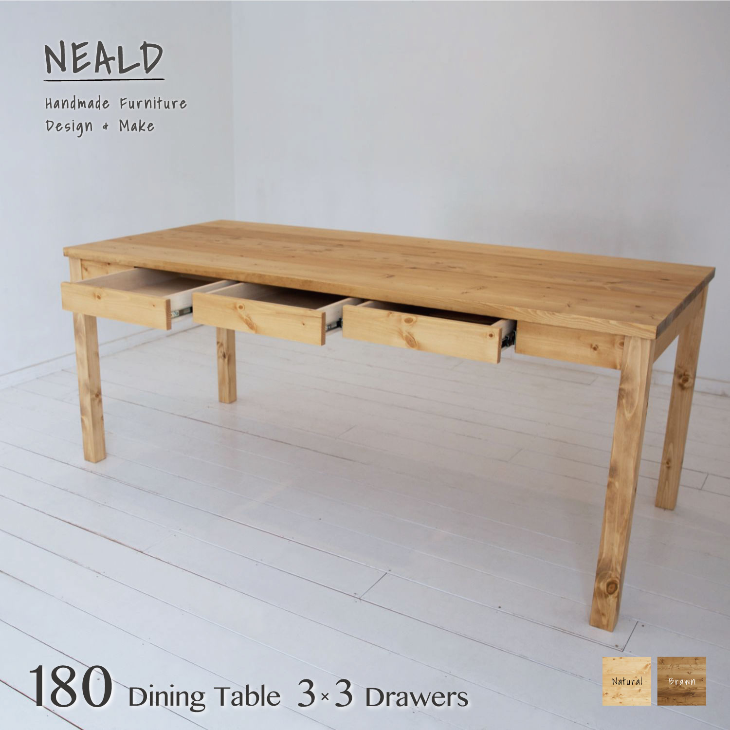 | NEALDで一番人気の引き出し付きテーブル 幅が180センチ(引き出し両側2列6杯)なので、 1人で仕事したり、横並びで2人でご飯を食べたり、 4~6人で食事するのにちょうど良いサイズ。 引き出しはあるとすごく便利です! カトラリー類はもちろん、リモコンや文房具に パソコンなどなど。テーブル周りで散らばりがちな あれこれを、きちんと収納できます。 引き出し付きテーブルにベンチを合わせると、 引き出しの中身も取り出しやすくてストレスフリーに。 幅・奥行・高さのサイズ変更も可能です。 ご自分にフィットするテーブルをNEALDが作ります! |