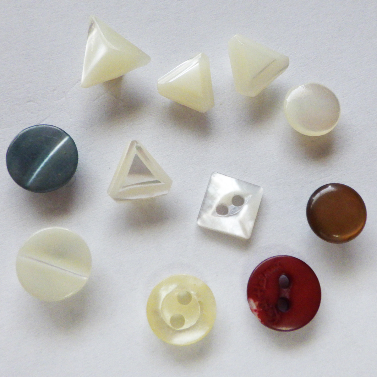 丸の小さいほうのシェルボタンは、もともと欠けているようです。赤のボタンも裏に一部剥がれが見られます。