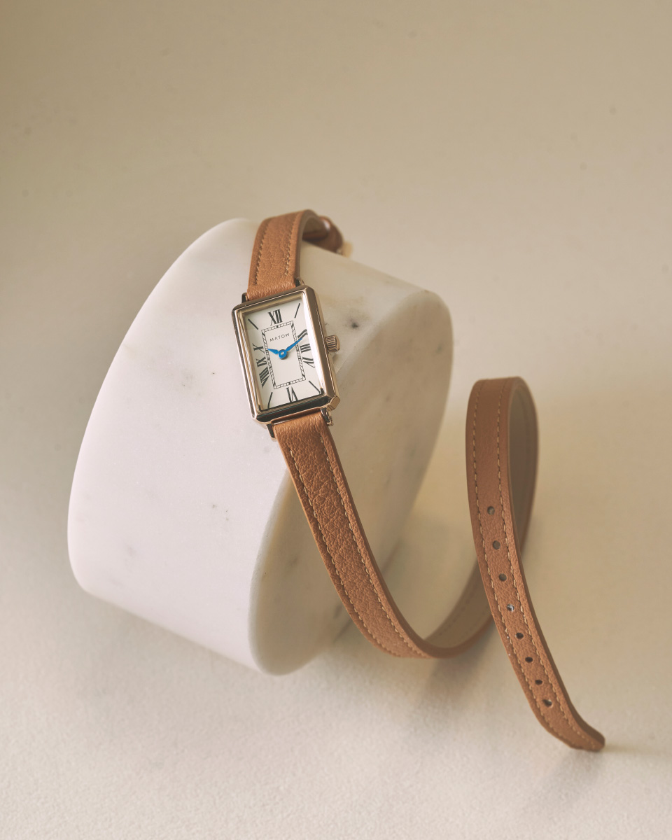 【マトウ MATOW 腕時計 レディース Tsuki Collection 月華 げっか スクエア ローズゴールド クリーム ダブルターン ベージュレザー MW003006 手首を静かに2周するレザーストラップが、月光のように腕に沿い、花のように軽やかに美しく、確かな存在感をまとわせます。小ぶりなスクエアケース(29mm×19mm)は同じ佇まいのまま、素材の変化が「新しい表情」を生み出しました。細くしなやかなレザーが二重に重なることで、一本の線では生まれない「奥行き」と「動き」が腕元に生まれ、その重なりが月が描く静かな流れのような優雅さを添えます。柔らかなラインが腕元に自然な広がりを生み、アクセサリーのような軽やかさで日常を彩ります。光と影の調和が生む、月華の世界観。クラシカルなローマ数字、ミニマルなフェイス。それらが二重レザーの質感と重なり合い、「線の美しさ」と「余韻」をより際立たせます。レザーがつくる柔らかな影、ケースが放つ控えめな光。そのコントラストが、ツキコレクションが描いてきた静かな美の世界観をより豊かに広げていきます。[マトウ MATOW 2025 新作]】