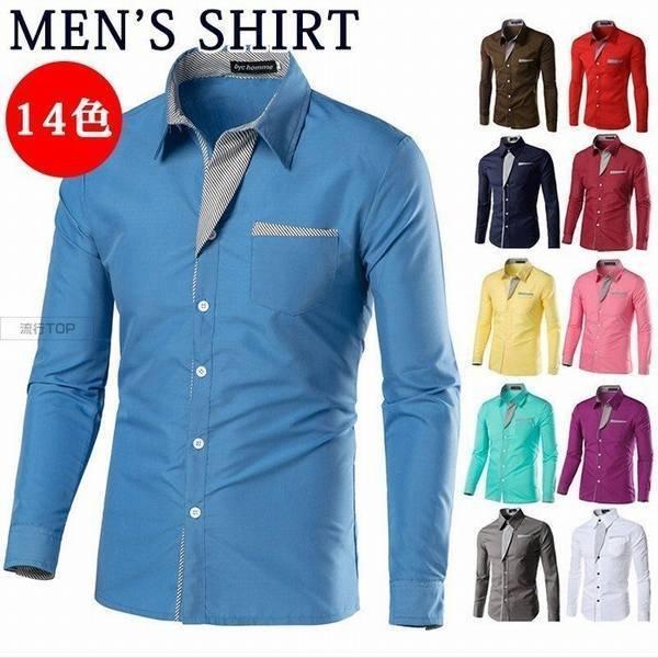 ポイント消化 シャツ 長袖 トップス ワイシャツ カラーシャツ 無地 14色 切り替え