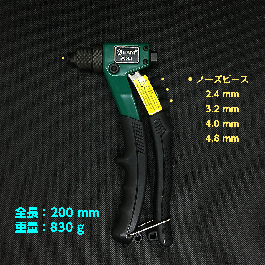 仕様:全長…約200mm、重量…830g、対応リベット径…2.4・3.2・4.0・4.8mm