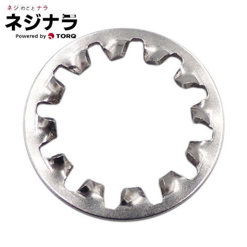 内側に歯を絞り上げた突起のついている座金です。 歯が部材に食い込むことによりゆるみを防止します。菊座金、ロックワッシャー、スターワッシャーなどと呼ばれます。