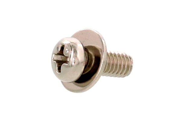 十字穴付きの 「なべ頭」 で、頭部座面に JIS規格の平座金(丸ワッシャー) を組込み、一体化した組み込みねじです。