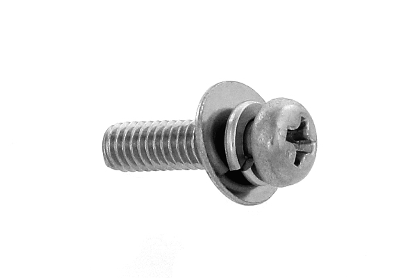 十字穴付きの 「なべ頭」 で、頭部座面に バネ座金(スプリングワッシャー) と JIS規格の平座金(丸ワッシャー) を組込み、一体化した組み込みねじです。