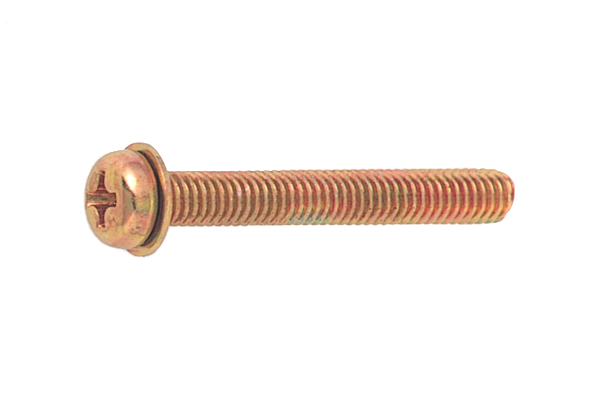 十字穴付きの 「なべ頭」 で、頭部座面に JIS規格の小形の平座金(丸ワッシャー) を組込み、一体化した組み込みねじです。