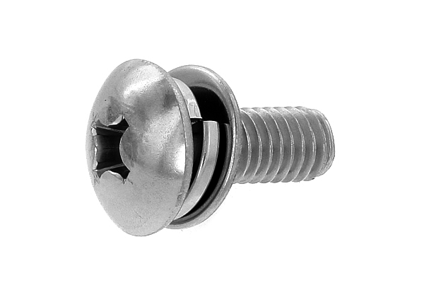十字穴付きの 「トラス頭」 で、頭部座面に バネ座金(スプリングワッシャー) と JIS規格の平座金(丸ワッシャー) を組込み、一体化した組み込みねじです。