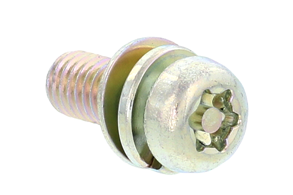 いたずら防止用の工具穴付きの 「なべ頭」 で、頭部座面に バネ座金(スプリングワッシャー) と JIS規格の小形平座金(丸ワッシャー) を組込み、一体化した組み込みねじです。