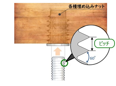 木材へ下穴をあけて埋め込む鬼目ナットで、頭部に六角形の工具穴があいており、六角レンチなどで木材に埋め込みます。