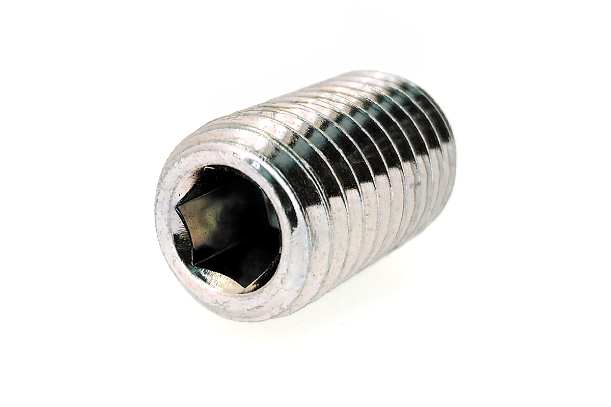 頭部の出っ張りがなく、ねじ部だけで形成されており、工具穴として六角穴の開いた形状です。 正式名称は「六角穴付き止めねじ」 と言うが、「イモネジ」、「ホーローセット」 とよく呼ばれています。
