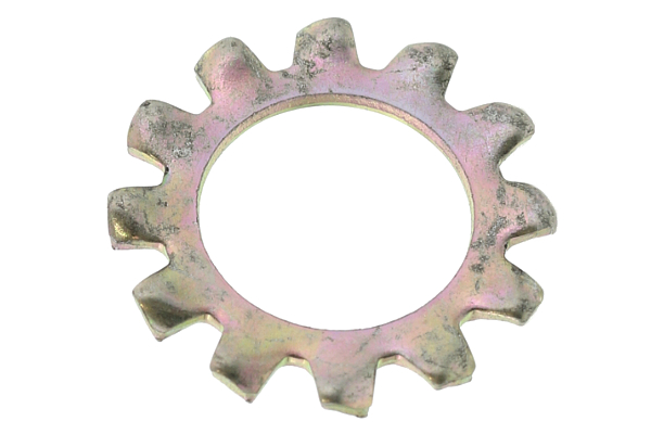 「歯付き座金」、「菊座金」 とも呼び、ボルトやナットを締結する際に、歯のねじれが平らになる 「バネ作用」 と、歯による相手材との摩擦力の増大によりゆるみ止め効果を発揮しますが、外周に傷などが目立ちます。